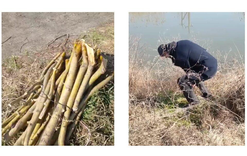 Свіжі обрізки гілок верби діаметром один-два сантиметри підприємець зібрав під час обрізки дерев в центрі селища. В одного з місцевих жителів взяв спеціальний лом. За допомогою цього нехитрого засобу Алім закопує гілки в землю у безпосередній близькості до води на відстані близько метра одна від одної, залишаючи більшу частину на поверхні.