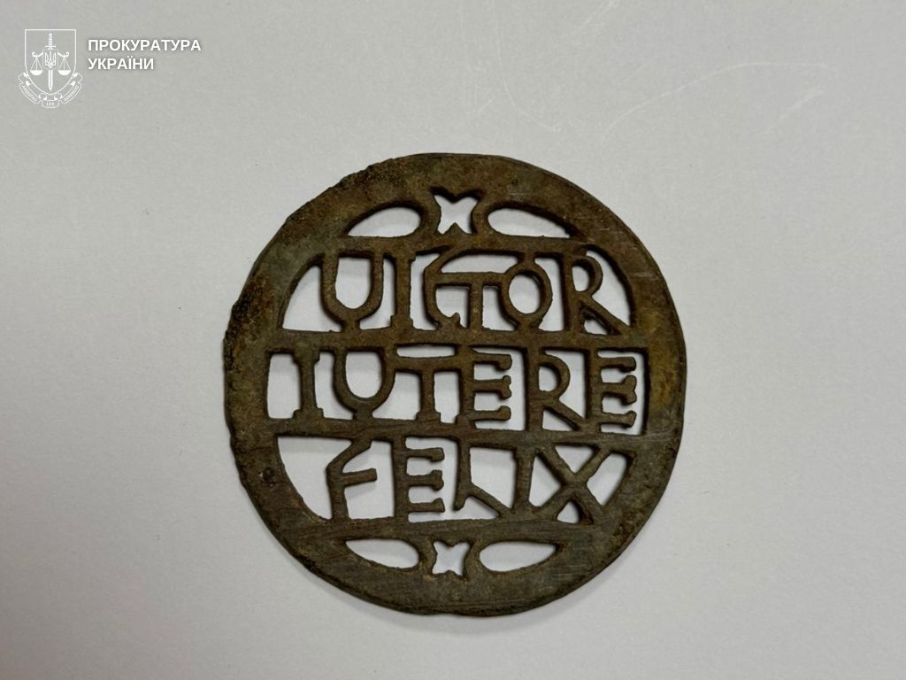 Як пояснив правоохоронцям завідувач сектору каталогізації та моніторингу Національного музею історії України Максим Левада, накладка мала напис «VICTOR I UTERE FELIX», що перекладається як «Переможцю, насолоджуйся щастям!»