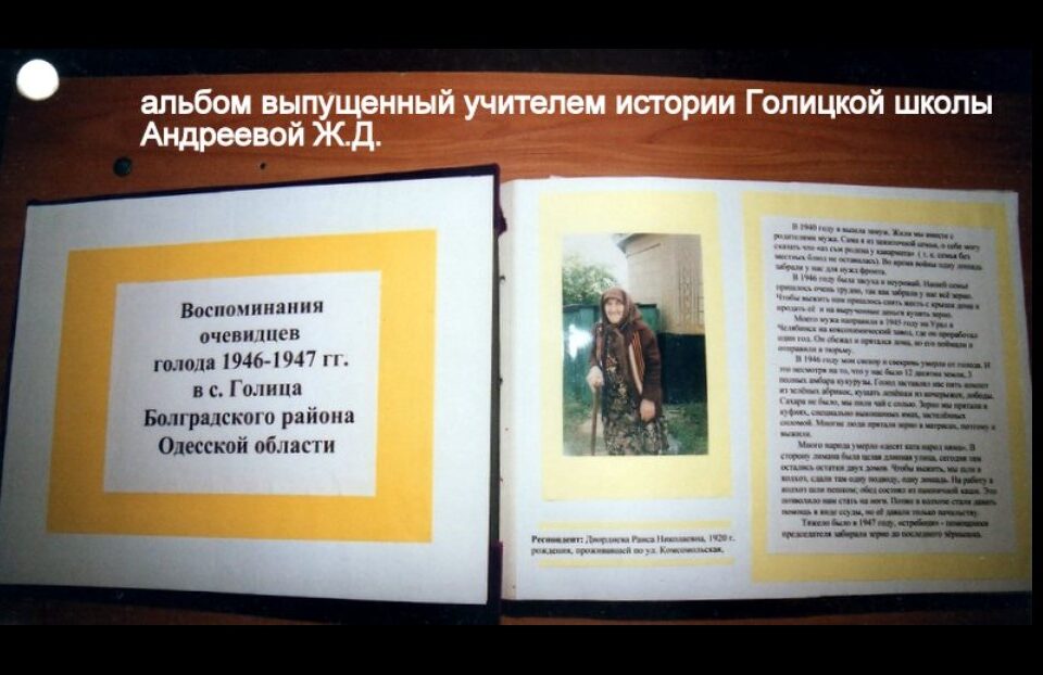 У березні 2023 року про події 1946-1947 років мені розповіла Жечева (Бужилова) Ю.П. 1940 року народження. Під час голодомору по селу проїжджали дві підводи з нарощеними бортами: одна збирала трупи по вулиці і в будинках, а друга забирала дітей у померлих батьків. Їх відправляли до дитбудинку в село Бабата (нині Острівне Ізмаїльського району). А там їх здавали в дитбудинок «ФІЗО». Через все це пройшов її майбутній чоловік Жечев. Потім, після повернення з трудового фронту, його забрав назад до Голиці рідний дядько. Майже весь рід Жечевих було замучено голодом, про це свідчать записи в архівах тих років.