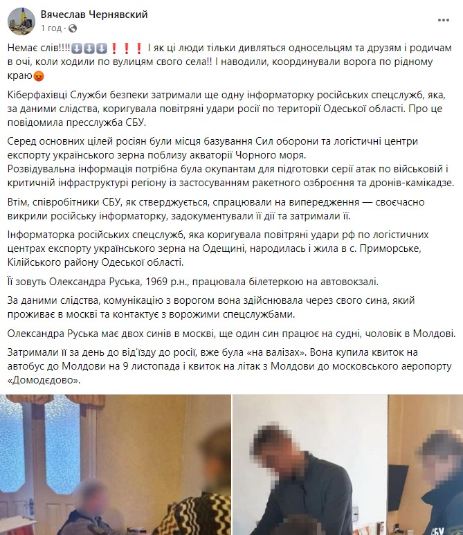 Як вже повідомляло інформаційне агентство «Юг.Today», днями кіберфахівці Служби безпеки України затримали ще одну інформаторку російських спецслужб, яка коригувала повітряні удари рф по території Одещини. Серед основних цілей ворога були місця базування Сил оборони та логістичні центри експорту українського зерна поблизу акваторії Чорного моря.