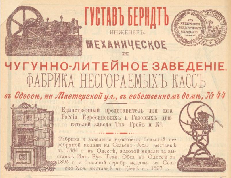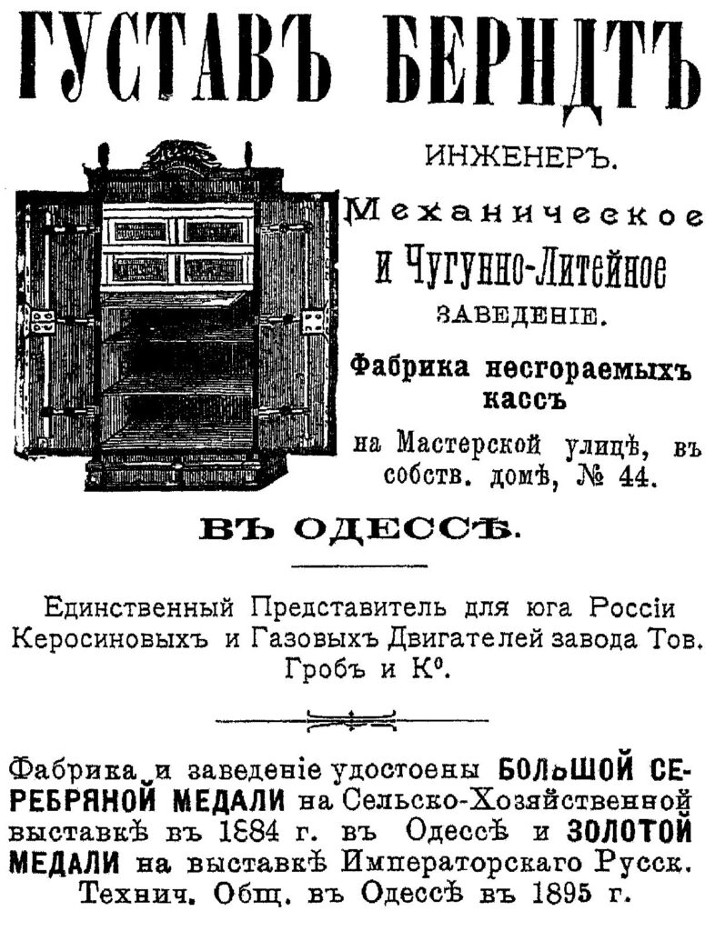 Німець-лютеранин Густав Берндт закінчив Політехнічну школу в Ганновері, після чого зібрав речі та й переїхав собі до Одеси, де 1876 року заснував виробництво. Виготовляли на його заводі вкрай необхідні одеситам вогнетривкі каси, сталеві та слюсарні вироби та пічні дверцята. А також машини для подрібнення та розтирання олійних фарб, какао, мигдалю. А ще – зручні садові лавочки на металевих ніжках, залізні меблі, колеса для плугів та інші корисні речі.