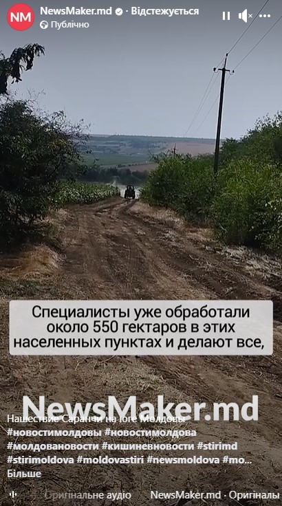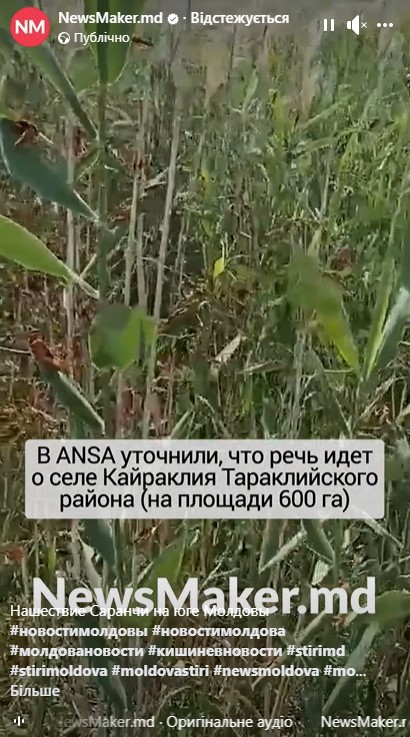 Національне агентство безпеки харчових продуктів Молдови (ANSA) 24 червня повідомило, що у сусідніх з Одещиною Чадир-Лунгському та Тараклійському районах виявили осередки сарани. За даними агентства, від комах вже постраждало близько 600 гектарів полів у районі села Кайраклія та 650 гектарів у селі Копчак. Про це повідомляє видання NewsMaker.md, передає інформаційна агенція «Юг.Today».