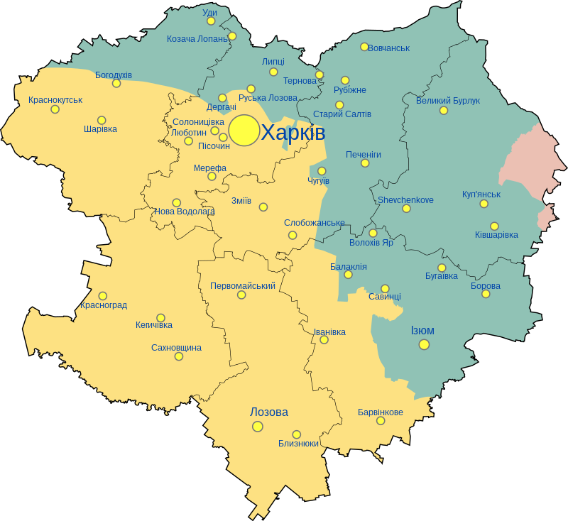 На мапі Харківської області жовтим кольором виділено території, які не були під окупацією та де не велися бойові дії