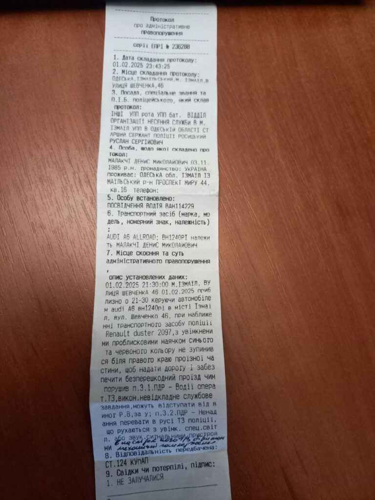 З машини, що зупинилася, вийшли двоє людей у формі. Одного з них Денис впізнав – виявилося, що чоловіки «трохи знайомі», ну так, як це буває в Ізмаїлі. Під час спілкування поліцейський свою вину визнав і додав, що «був би на власному авто – вирішили б питання одразу, бо сто відсотків сам винен».