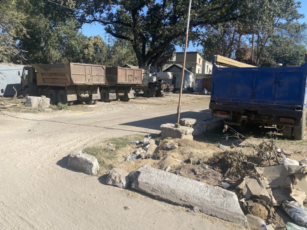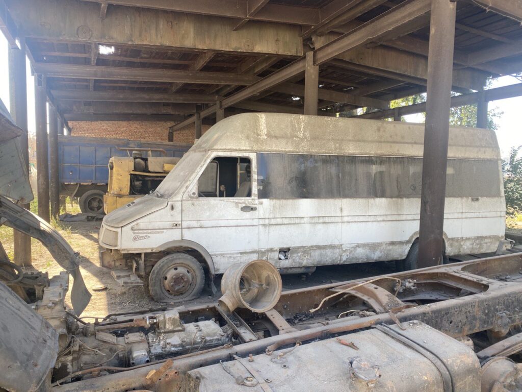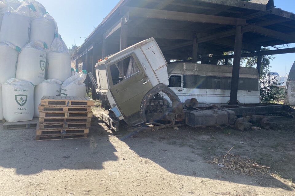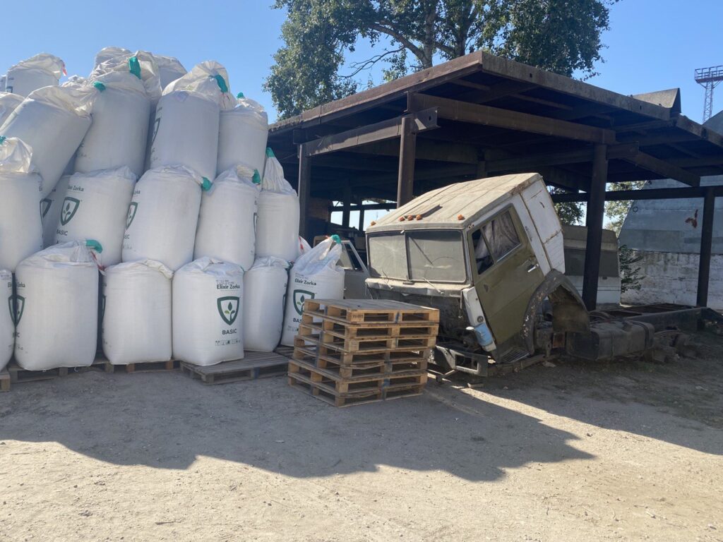Далі ми побували на складських майданчиках ТОВ «Еліксир Україна». Зазначимо, що майже кожен клаптик землі портопункту, який не задіяно в переміщені автотранспорту, завалено усіляким непотрібом ТОВ «Зерновий термінал Кілія». Усюди несправні іржаві автомобілі, колоди спиляних дерев, якийсь незрозумілий мотлох. Усе це перешкоджає діяльності інших операторів. Наприклад, на фото нижче ми бачимо майданчик з навісом, де мали б зберігатися добрива у біг-бегах ТОВ «Еліксир Україна», але натомість площа захаращена неробочим автотранспортом, який мабуть там стоїть десятиліттями.