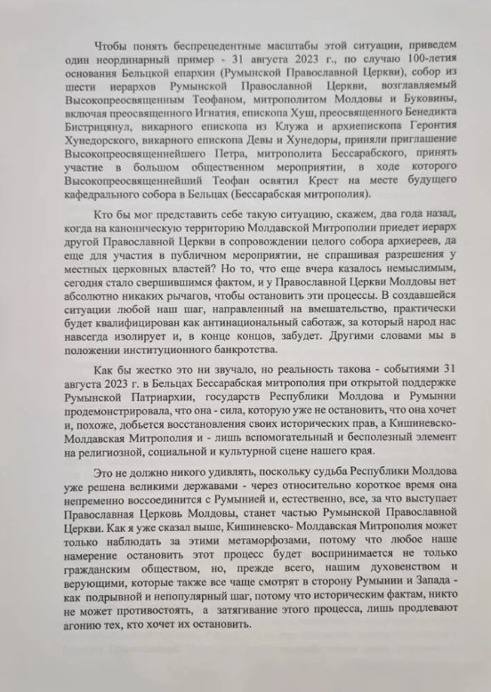 Більш того, митрополит пророкує об’єднання Молдови з Румунією («доля Молдови вже вирішена великими державами») і припускає, що все, «за що виступає Православна церква Молдови, стане частиною Румунської православної церкви». Митрополія Молдови, за його словами, не зможе протистояти цьому, тому що «історичним фактам ніхто не може протистояти». Крім того, глава Митрополії Молдови звинувачує московський патріархат у прагненні «увібрати Молдову в чужий їй «російський світ»».