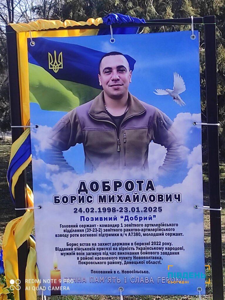 Борис Доброта. Молодший сержант Борис Доброта загинув 23 січня за місяць до свого 27-річчя в районі населеного пункту Новополтавка Покровського району Донецької області. Народився він у селі Плавні. З 10 років жив у селі Новосільське. Після 9 класу закінчив Ізмаїльське професійне училище №9, де здобув спеціальність матроса-моториста. Після навчання був призваний до армії. Служив у прикордонних військах. Бориса з усіма почестями поховали в Новосільському 29 січня 2025 року.