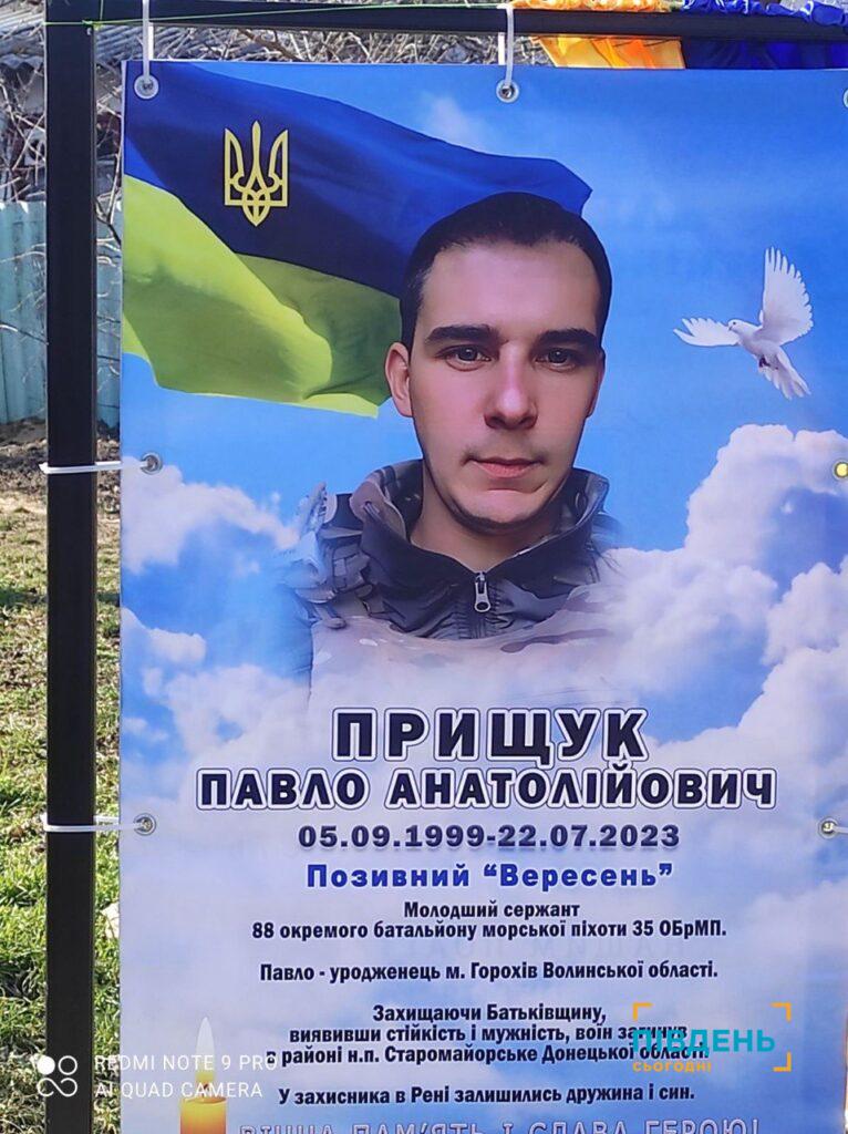 Прищук Павло. Молодший сержант 88-го окремого батальйону морської піхоти, уродженець міста Горохів Волинської області загинув 22 липня 2023 року. Йому було всього 23 роки… У захисника в Рені залишилась дружина і син.