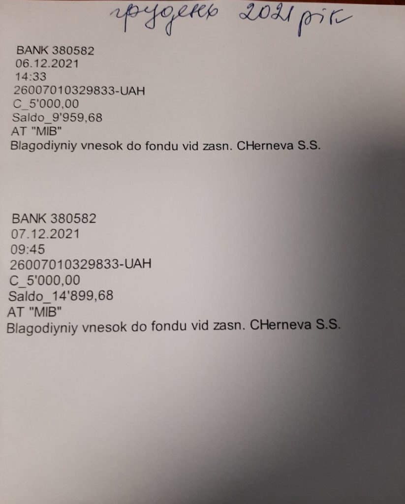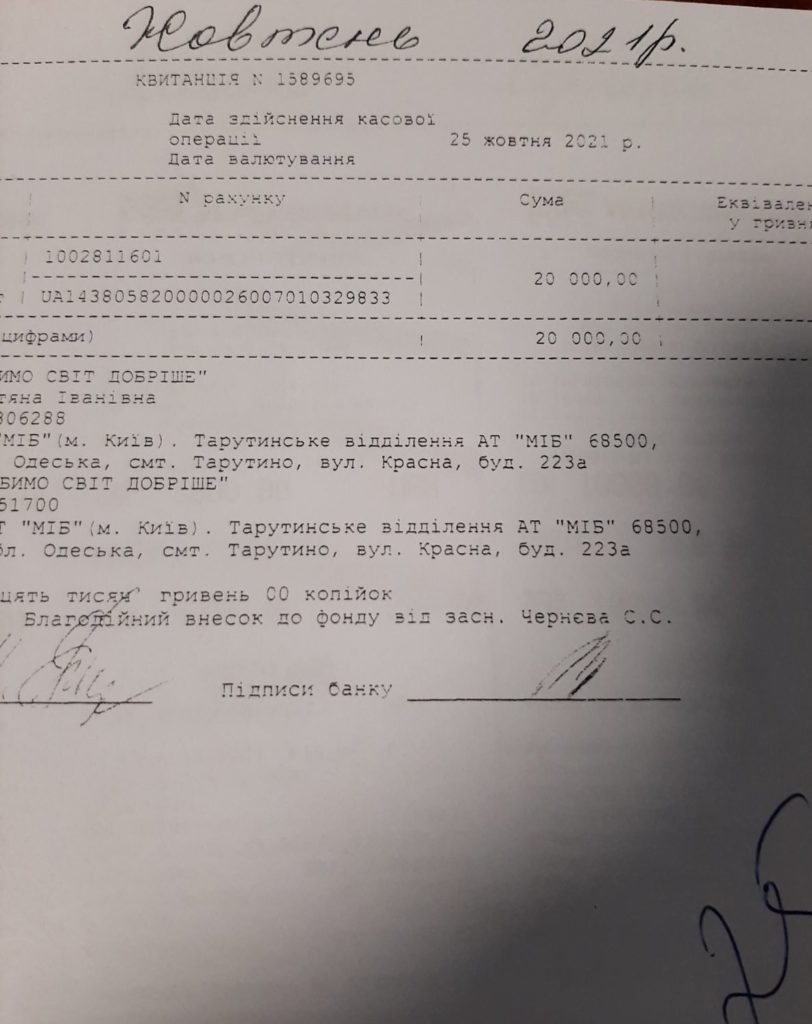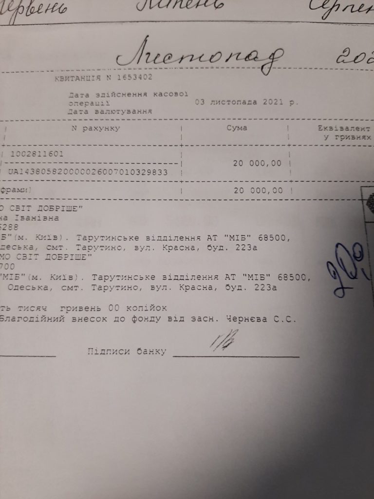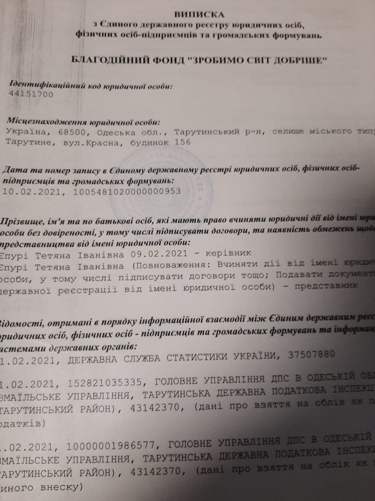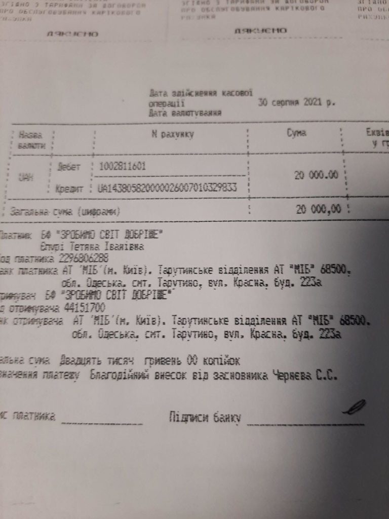 Директор благотворительного фонда рассказала журналисту информагентства «Юг.Today», что идея создания благотворительного фонда принадлежит главе Тарутинской громады Савве Черневу. Он является учредителем и основным «донором» фонда. Ежемесячно Савва Степанович со своей зарплаты перечисляет от 10 до 30 тысяч гривен. Об этом свидетельствуют чеки, которые предоставила нам Татьяна Ивановна Епури.