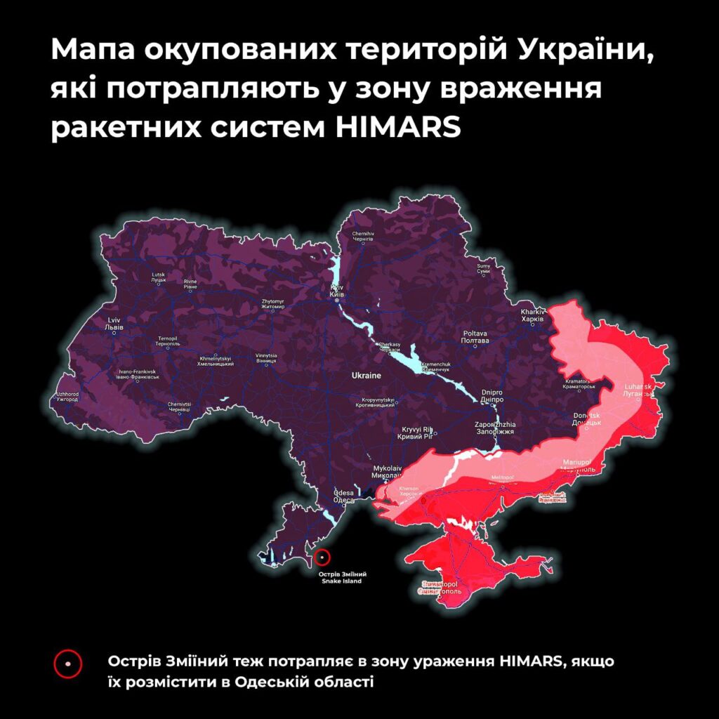 Позже в сети, в том числе на официальном канале спикера Одесской областной военной администрации Сергея Братчука, появилась карта оккупированных территорий Украины, которые попадают в зону поражения HIMARS. На карте выделен и Змеиный с пометкой о том, что остров попадает в зону поражения реактивной системы залпового огня при условии ее размещения на территории Одесской области. Отметим, что дальность оружия составляет 70 километров.