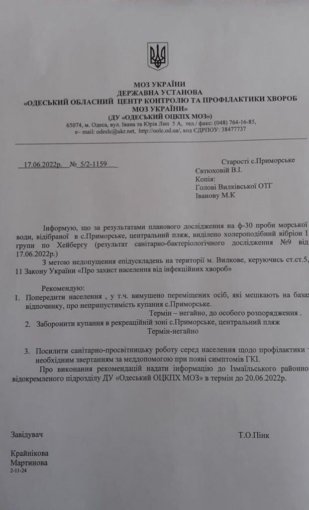 Одеський обласний центр контролю та профілактики хвороб МОЗ України рекомендує терміново заборони купання в рекреаційній зоні Приморського Вилківської громади Ізмаїльського району. Річ у тому, що за результатами нещодавнього планового дослідження на ф-30 проби морської води, відібраної на центральному пляжу курорту, виділено холероподібний вібріон І групи по Хейбергу. Відповідний лист-звернення опублікований в офіційній групі в Фейсбуці  Приморського старостинського округу, передає ІА «Юг. Today».