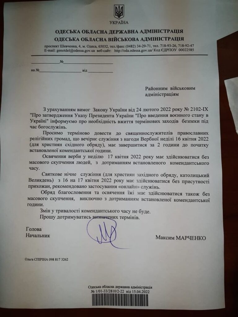 В воскресенье, 17 апреля, в православных церквях восточного обряда пройдет освящение вербы. А в католических храмах – Пасхальное богослужение. В связи с этим начальник Одесской областной военной администрации Максим Марченко направил главам районных военных администраций письмо с указаниями о времени проведения этих мероприятий, сообщает информационное агентство «Юг.Today».