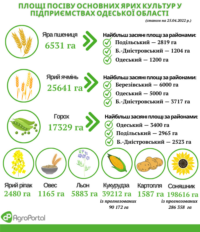 Если говорить о цифрах, то под урожай-2022 в Одесской области засеяно 750 тыс. га яровых культур. Аграрии уже закончили сеять горох, ячмень, пшеницу. Кукуруза посеяна на 75% запланированных площадей, подсолнечник – на 90%. В течение одной недели будут завершены все посевные работы.