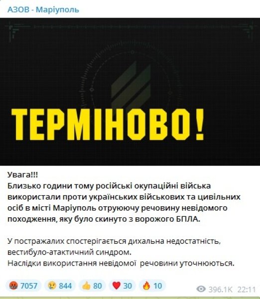 Позже лидер «Азова» Андрей Белецкий проинформировал, что у военных явные признаки отравления, но без серьезных последствий. Российские войска не могут захватить город и используют запрещенные средства.
