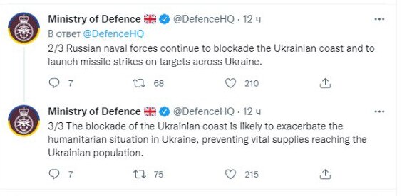 «Блокада украинского побережья, вероятно, усугубит гуманитарную ситуацию в Украине, препятствуя доставке жизненно важных грузов украинскому населению», – предполагают в Минобороны Великобритании.