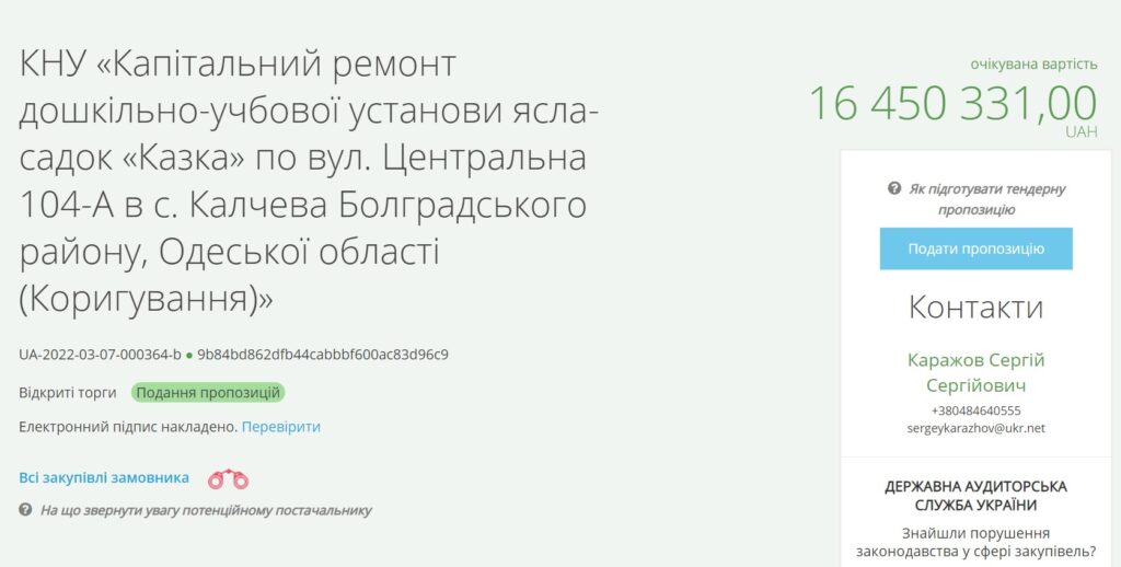 По данным электронной системы закупок Prozorro, Василевская громада 7 марта, то есть уже после начала войны, объявила тендер на работы по капитальному ремонту детского сада «Сказка» в селе Калчева.