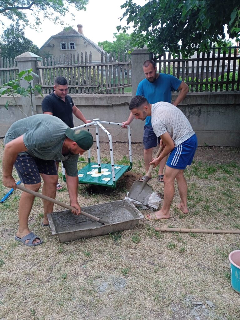 Из бывшей «вертушки», которая была при входе в ДК, сделали и установили маленькую карусель, разрисовав ее яркими цветами.