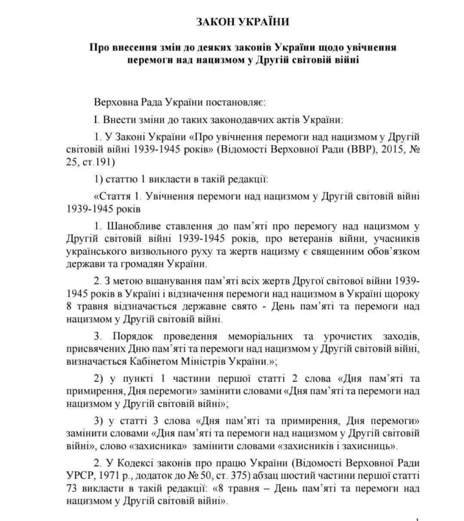 Верховная Рада зарегистрировала проект закона об увековечении победы над нацизмом во Второй мировой войне