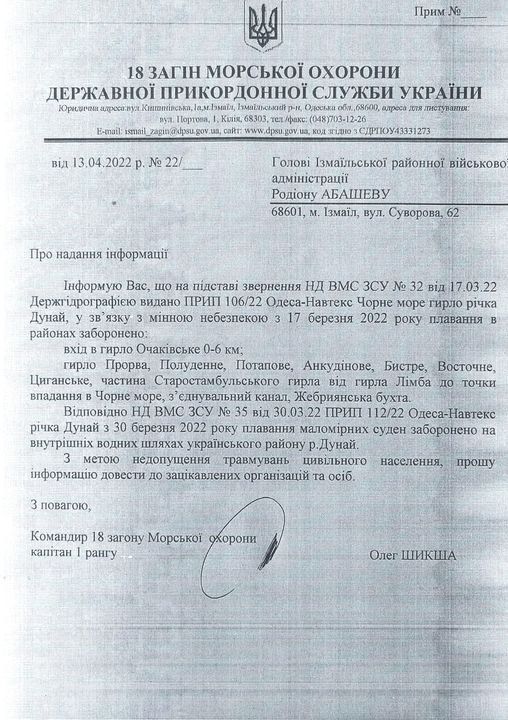 Сегодня, 20 апреля, исполком Вилковского горсовета обнародовал официальное письмо Морской охраны Госпогранслужбы, адресованное главе Измаильской районной военной администрации Родиону Абашеву. В документе детализируется, на каких участках реки Дунай запрещено плавание и, соответственно, рыбный промысел в связи с минной опасностью. Об этом сообщает информагентство «Юг.Today».