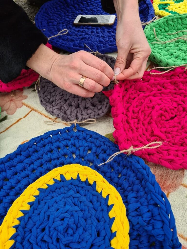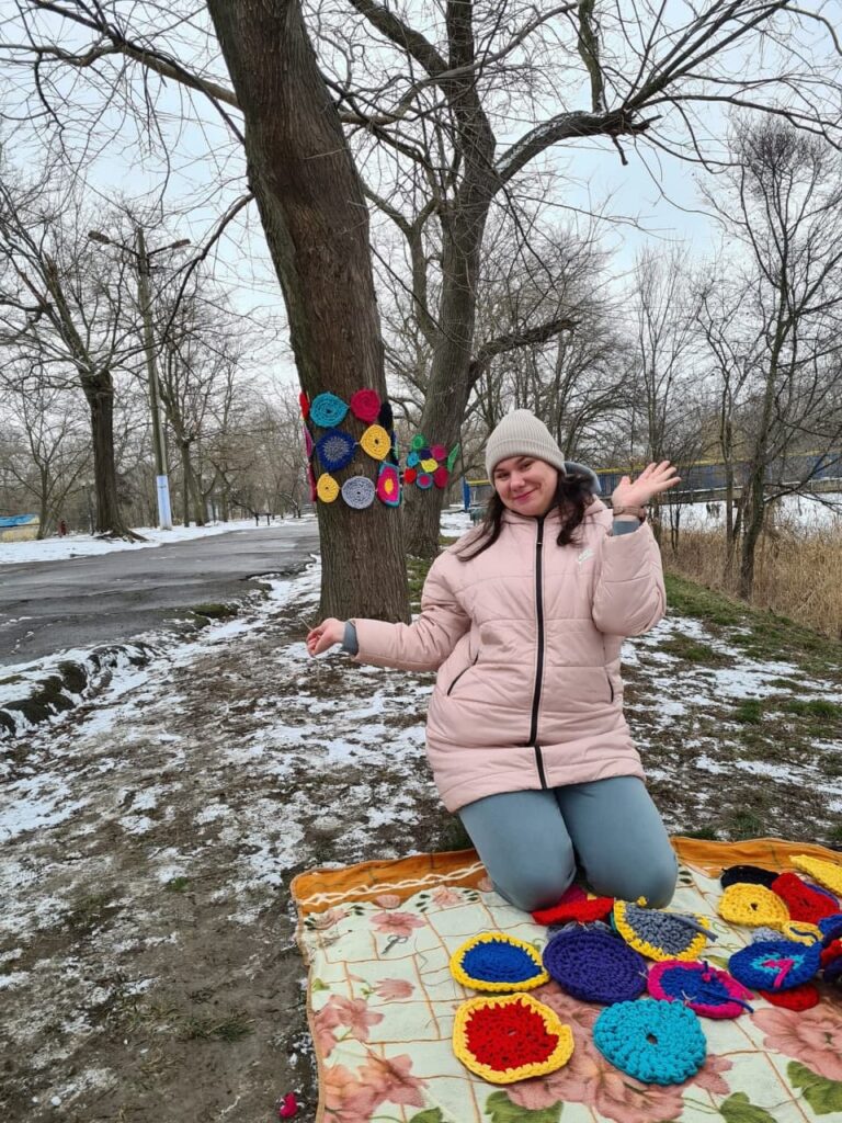Для своего арт-объекта они связали несколько десятков небольших круглых ковриков и, соединив изделия между собой, одели в яркие одежки деревья вдоль улицы.