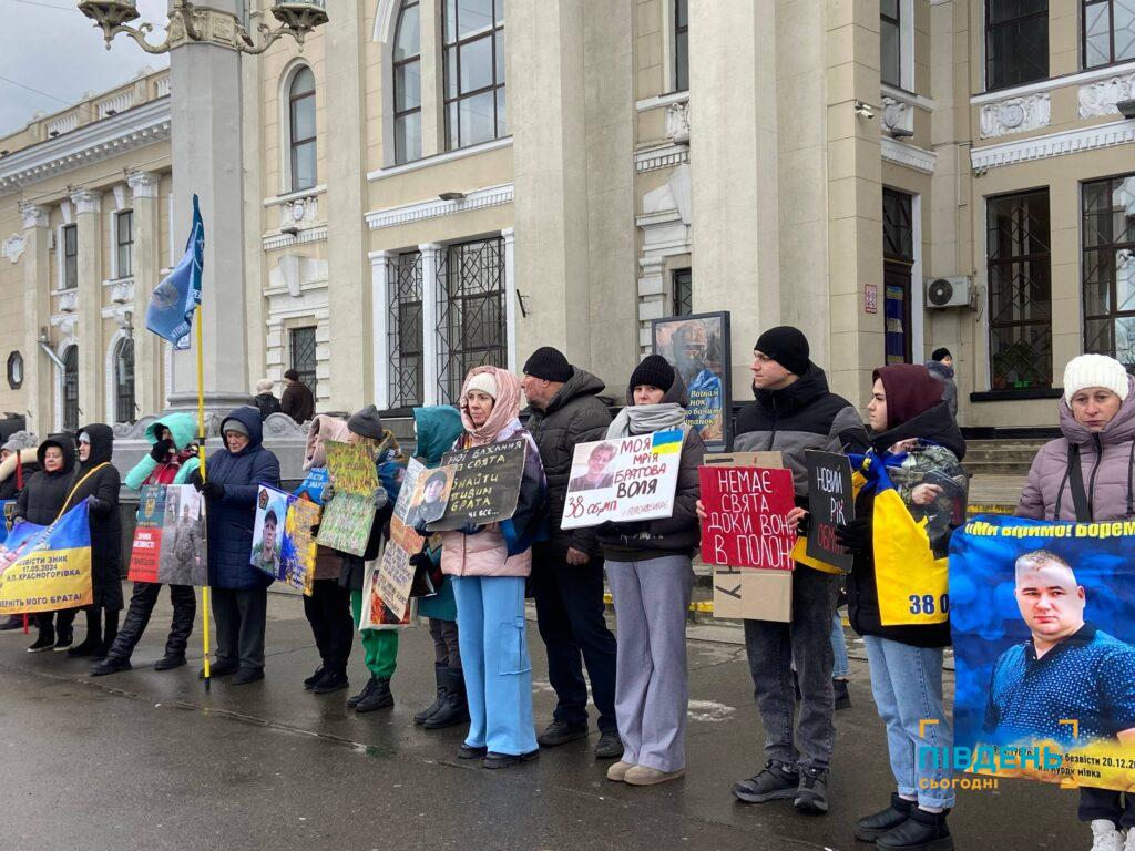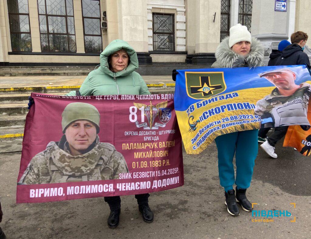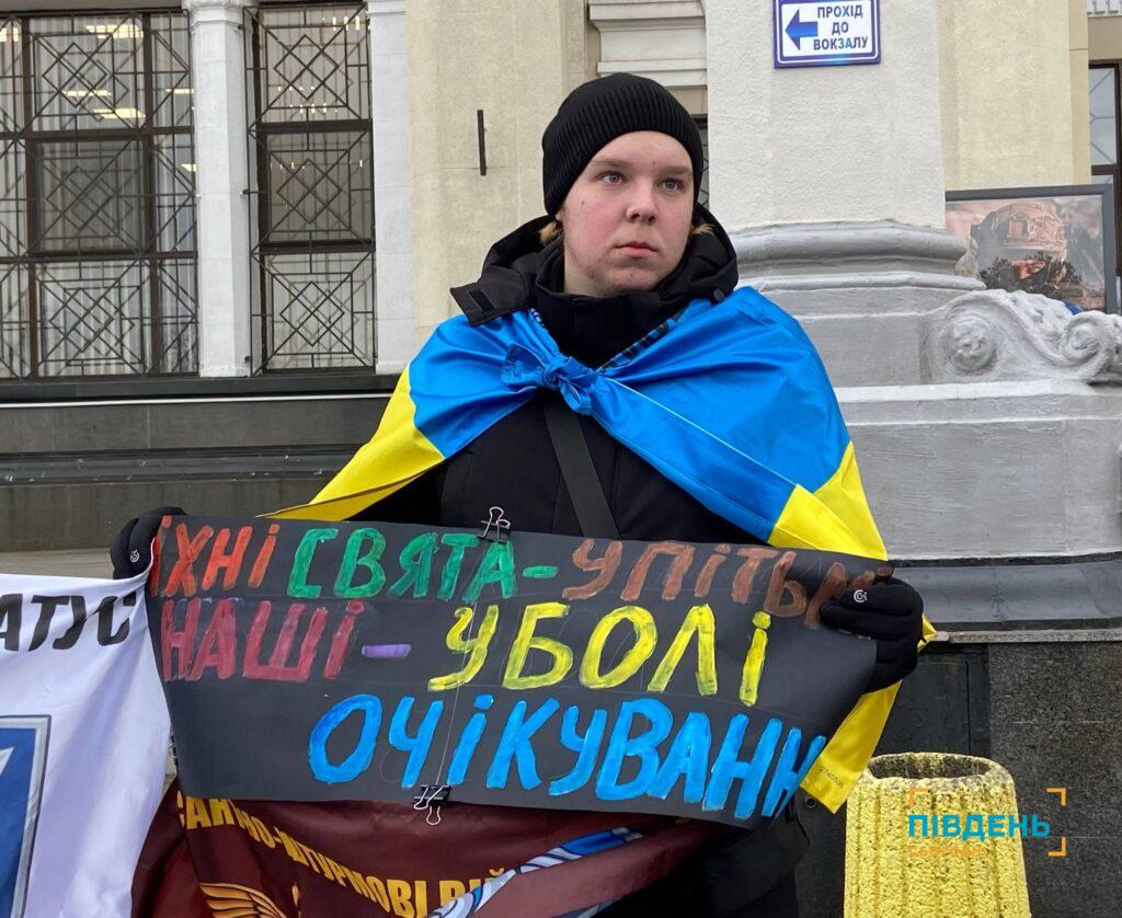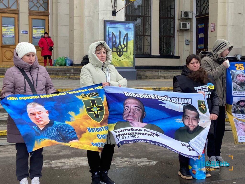 Вздовж усього центрального входу залізничного вокзалу з прапорами, плакатами та портретами стояли десятки учасників, аби нагадати про тих, хто боровся за свободу України, а зараз його доля невідома, а також цивільних, яких незаконно утримує росія.