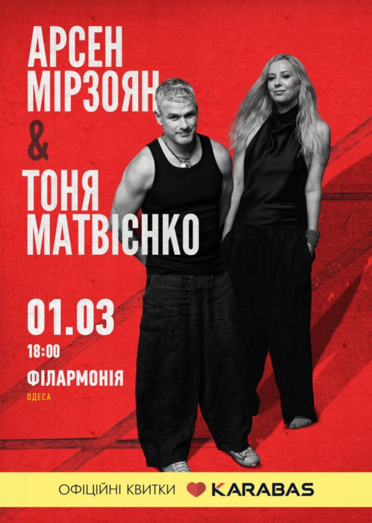 Квитки на концерт доступні на сайті https://odesa.karabas.com/arsen–mirzoyan–ta–tonya–matviyenko–vpershe–razom-5/order/