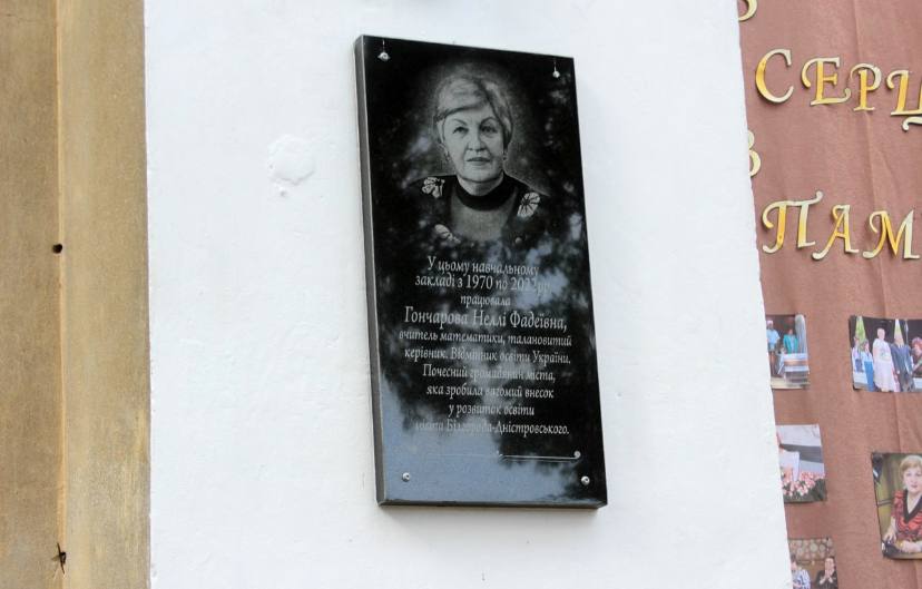 На фасаді Білгород-Дністровського Ліцею №1 встановили меморіальну дошку Неллі Фадеївні Гончаровій – Почесному громадянину міста Білгорода-Дністровського, Відміннику освіти України, вчителю математики, яка працювала в цьому навчальному закладі понад 50 років, зокрема – на посаді директора школи. Про це розповіли у міській раді, передає інформаційна агенція «Південь сьогодні».