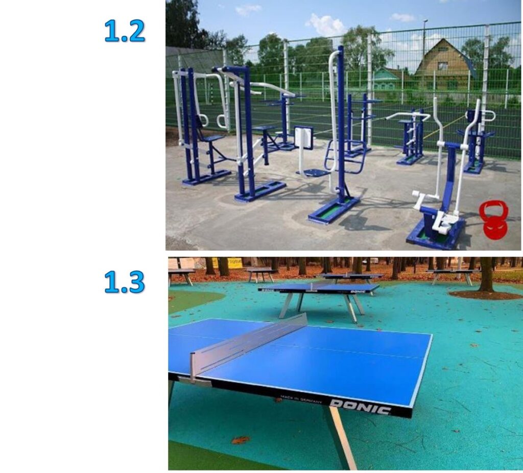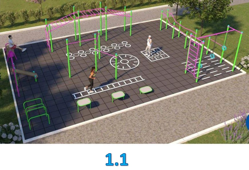 Так, першою пропонують створити зону вуличних тренажерів — місце для занять спортом на свіжому повітрі. Комплекс вуличних тренажерів (орбітрек, турнік, силові для рук та ніг, бруси тощо) значно урізноманітнять спортивні заняття.