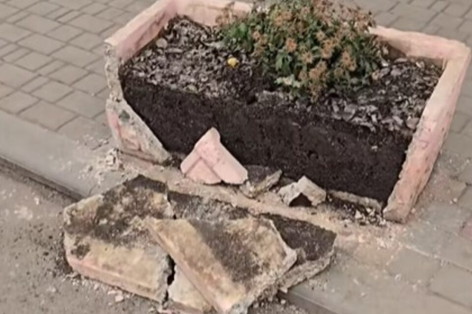 Отже, проходячи повз, Сергій зафільмував понівечену клумбу, а точніше величезний вазон, в якому ще ростуть квіти. Зазначимо, що вазон зроблений з бетону чи якось схожого за властивостями матеріалу. Тож щоб повністю розбити одну з його стінок, потрібно прикласти чималі зусилля.