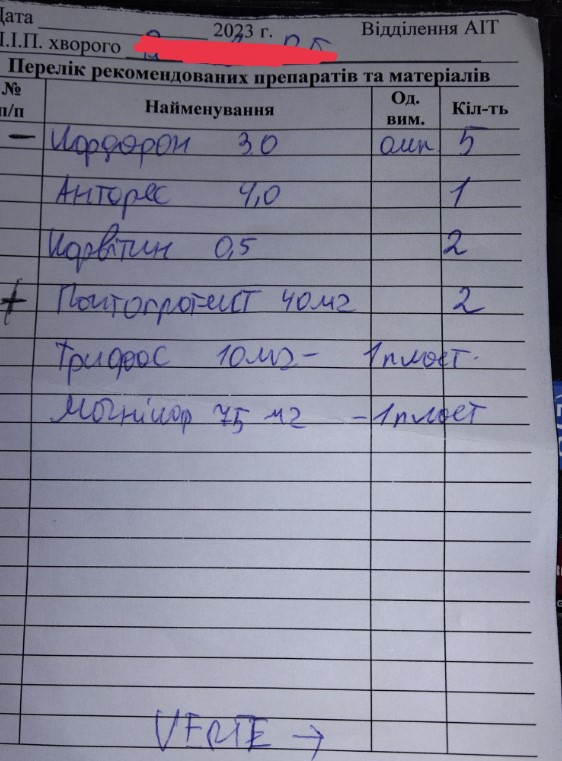Також нижче фото списків: порошок, спирт, катетер, пластир, кордарон, пантопротек (пантопразол), трифас, магнікор. Ок, таблеток часто в лікарнях не має, згоден, як і з усім іншим, але не з кордароном, спиртом, катетером та порошком. Це не проблема фінансів для сім’ї, хоча для багатьох і ці суми є великими. Це принципова ситуація, яка не припустима в лікарні в 2023 році + закриті вночі аптеки», – пояснив свою позицію лікар.