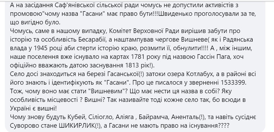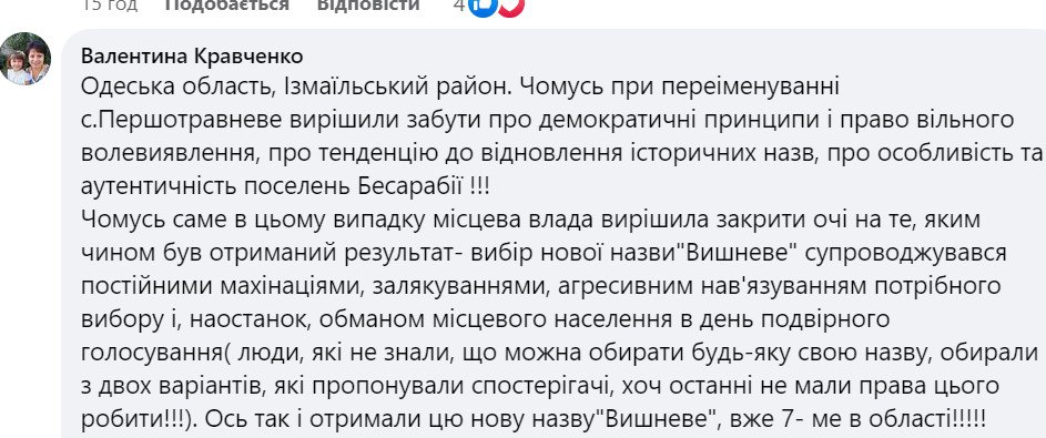 В коментарях до посту депутата місцева активістка Валентина Кравченко пише, що вибір нової назви супроводжувався махінаціями, залякуваннями, агресивним нав’язуванням та обманом голосуючих. А комітет ВР просто вирішив забути про історію та особливості Бессарабії.