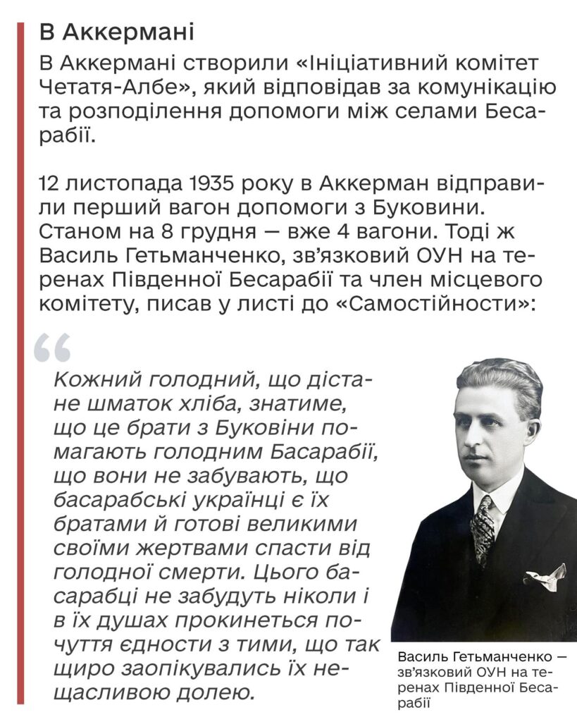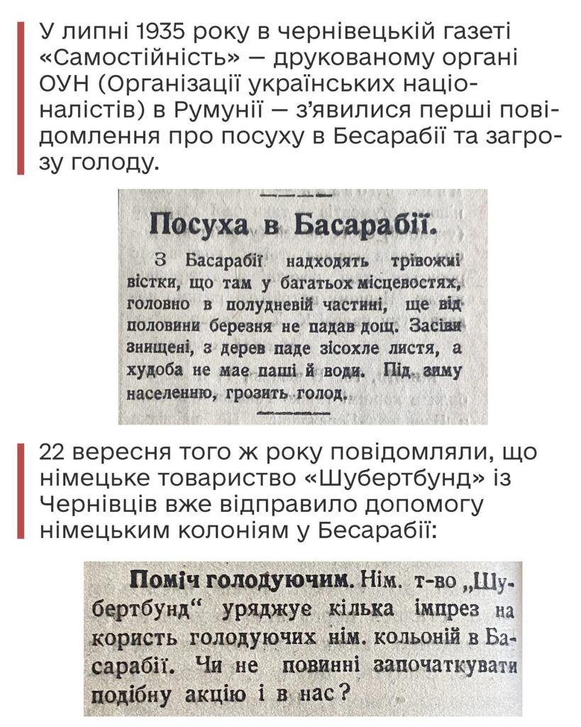 1934–1935 роки були надзвичайно посушливими для Південної Бессарабії. Врожай загинув, запаси вичерпалися, і вже восени 1935-го селяни стояли на порозі голоду. У той час Буковина, як і Бессарабія, перебувала під румунською окупацією, проте тут вже діяла місцева гілка ОУН – Організації українських націоналістів, яка сприяла розвитку національного руху. Як в організації допомагали вижити жителям Бессарабії, у тому числі Буджака, розповіли активісти проєкту «Аккерманіка: про Білгород – Аккераман та Буджак», передає видання «Південь сьогодні».
