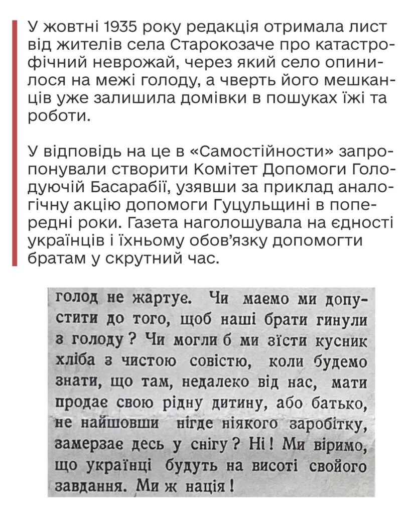 Дізнавшись про голод у Південній Бессарабії, редакція газети ініціювала створення Українського Допомогового Комітету для Басарабії. Так розпочалася масштабна благодійна акція: по всій Буковині збирали гроші, зерно, картоплю та інші харчі. Серед сіл, що долучилися, були Мамаївці, Адинката (Глибока), Сторожинець, Кіцмань, Лужани, Валява, Суховерхів, Вижниця, Виженка, Ревне, Карапчів, Берегомет та інші.