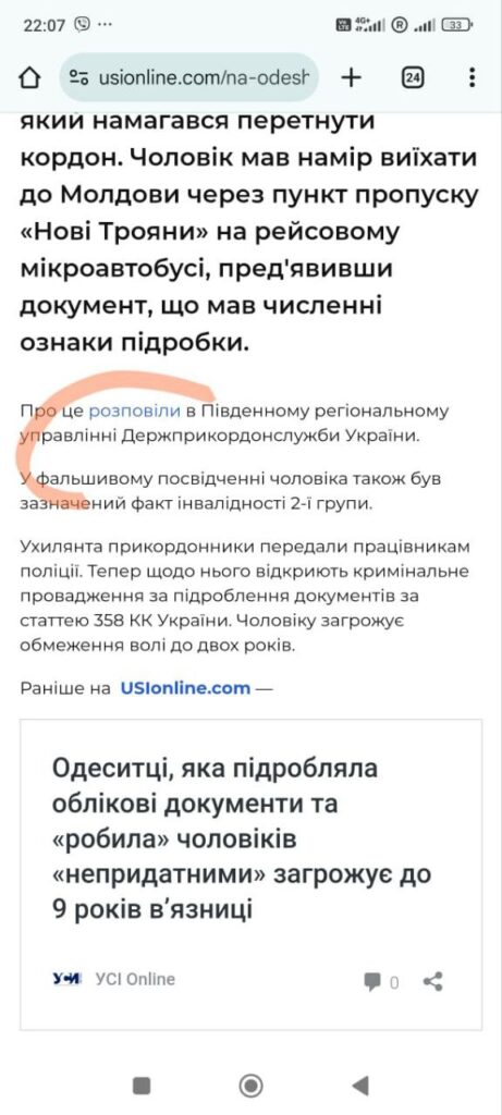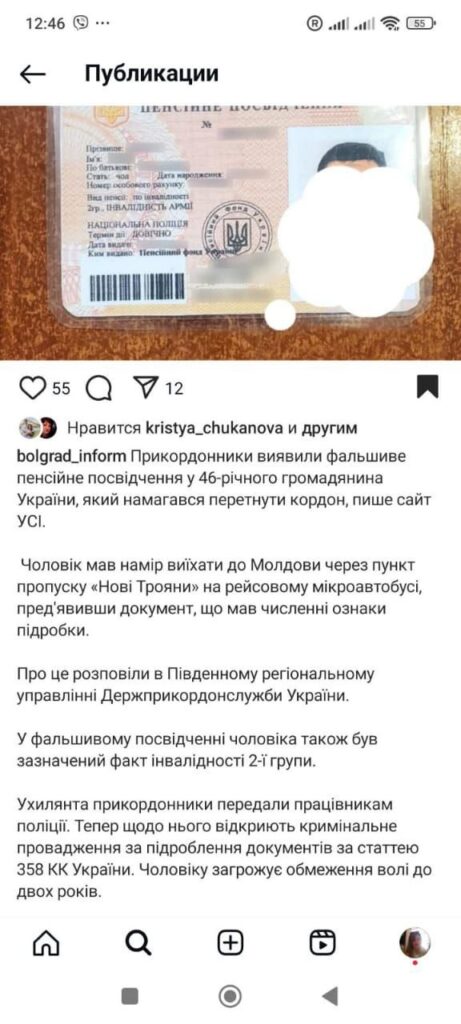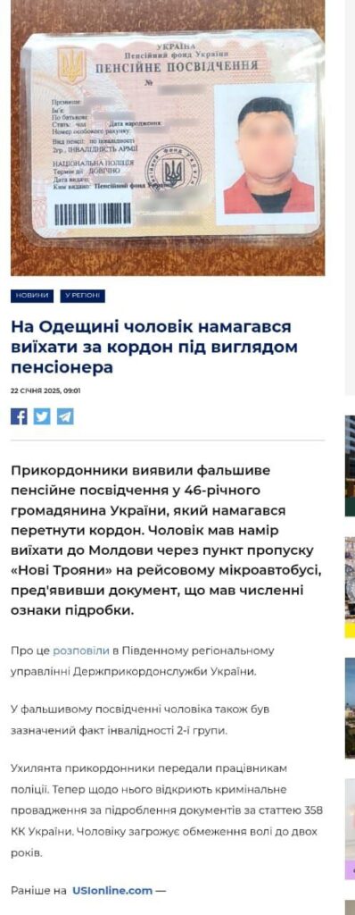Але майже одразу після затримання на сторінці у Фейсбук Південного регіонального управління Державної прикордонної служби України з’явилася публікація про те, що у пункті пропуску «Нові Трояни» затримали ухилянта з підробним пенсійним посвідченням. І неначе тепер чоловіку за статтею 358 КК України загрожує обмеження волі до двох років.