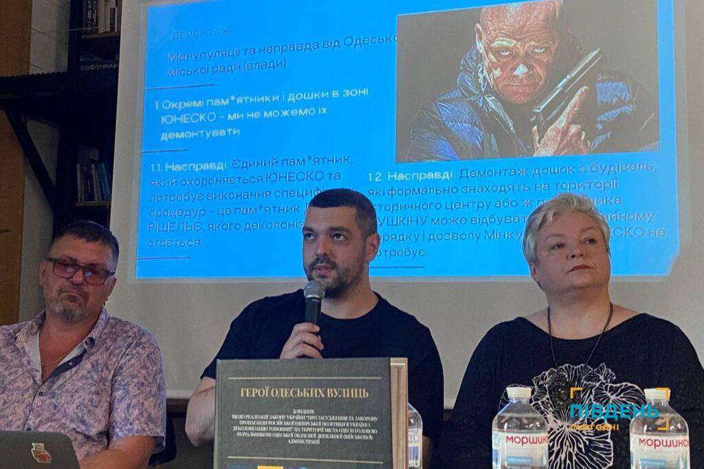 «Коли Українська революція отримала поразку у війні за незалежність у двадцятому сторіччі, більшовики швидко почали формувати новий пантеон героїв, «великих» одеситів, і монополію на цих «велики» одеситів зазвичай віддавали тим, хто якось пов’язаний з Одесою, але все життя, або більшість життя проживав в москві. Це такі відомі літератори, як Бабель, Катаєв, Олеша, Багрицький, Ільф та Петров. Тобто як Радянський союз, так і росія, так і, на жаль, місцева влада тривалий час просували суспільству виключно позитивні риси таких персонажів, підкреслювали їх величність через те, що вони є загальнорадянського масштабу, жили і працювали в москві – це «великі» люди. Якщо дискусія починалась на тему того, щоб висвітлити когось, хто в цей пантеон не входить, то й історики, і політики, і будь-які дослідники наражались на таку шовіністичну критику, навіть маргіналізацію. Тобто будь-які спроби подискутувати на тему того, що в Одесі є також інші великі діячі, і це і українці, і євреї, і представники інших національностей, які не були прихильні до Радянського режиму чи російської імперії – вони наражались на гостру протидію і критику», – прокоментував голова ГО «Історія.Культура.Демократія».