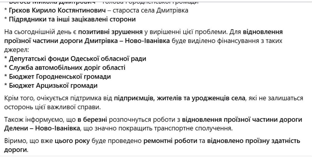 І ось у березневій публікації зазначається наступне: «На сьогоднішній день є позитивні зрушення у вирішенні цієї проблеми. На відновлення проїзної частини дороги Дмитрівка-Нова Іванівка буде виділено фінансування з таких джерел: депутатські фонди Одеської обласної ради, Служба автомобільних доріг області, бюджет Городненської громади, бюджет Арцизької громади. Крім того, очікується підтримка від підприємців, жителів та уродженців села, які не залишаться осторонь цієї важливої справи».