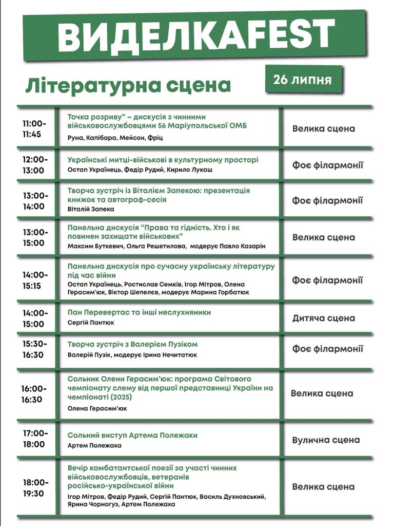 Зокрема, 26 липня на «Виделкаfest» відбудеться вечір комбатантської поезії. Свої вірші читатимуть чинні військовослужбовці, ветерани російсько-української війни: Артем Полежака, Сергій Пантюк, Ярина Чорногуз, Василь Духновський, Ігор Мітров, Федір Рудий. Традиційно, окрім текстів учасників, зі сцени також пролунають вірші поетів і поеток, які з різних причин не можуть особисто взяти участь у фестивалі. Музичний супровід заходу здійснюватиме Діана Гульцова – піаністка, заслужена артистка України, солістка Одеської обласної філармонії імені Давида Ойстраха.
